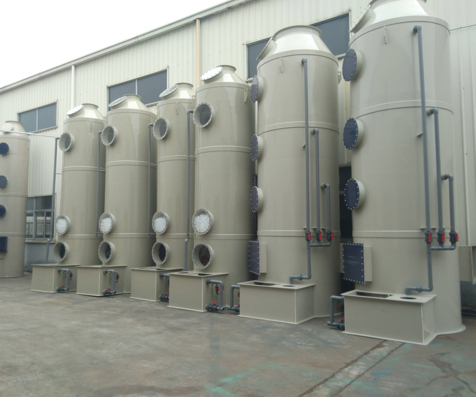 ②强度高、占地面积小:制作方便、便于安装检修、强度高、占地面积小。喷淋形式采用两层或三层填料,三级喷淋,使气液更充分接触,提高净化效率。本塔配用玻璃钢离心通风机和防腐水泵即可;